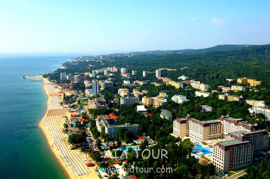 The resort is smothered in lush vegetation and with the numerous bushes and trees it resembles a real park. The mineral water running out of several big pipes onto the beach, as well as the marvellous deciduous wood bordering the Frangen Plateau turn Zlatni Pyasutsi into one of the pearls of the Bulgarian coast. The construction works commenced back around the year of 1950, and is still going on. Most of the alleys are asphalt-covered, the shore is paralleled by small streets, nice cosy hotels with picturesque parks around them, steps leading to small bays on both sides of the resort – favourite corners for tourists and holiday-makers in search for solitude.