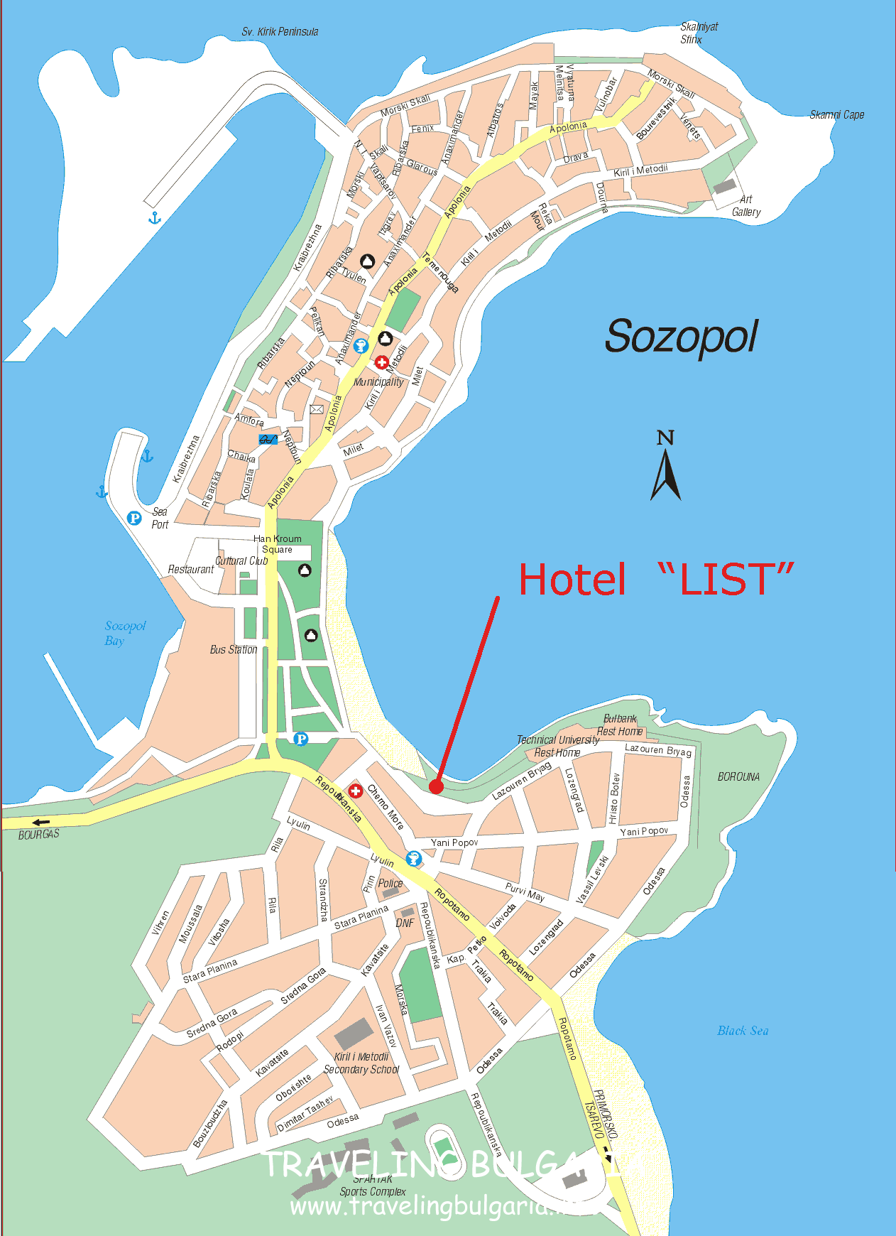 is located in the centre of the town 20 m from the beach and has 7 apartments and 80 double rooms. All of them are equipped with bathrooms , WC , balconies , refrigerators , satellite TV , radio , mini-bar and air-conditioner. The apartments and the rooms look down onto the bay or onto the street. The hotel has 2 lobbies with reception , a lobby-bar , a restaurant with a bar and terrace , 2 elevators , a souvenir-shop and a panorama-bar with a beautiful view of the bay , fitness-gym and a swimming pool. Such services as sauna , solarium , massage , beauty parlour , Darts , mini-golf and mini-football are at your disposal. Hotel "LIST" is open to the public during the whole year.